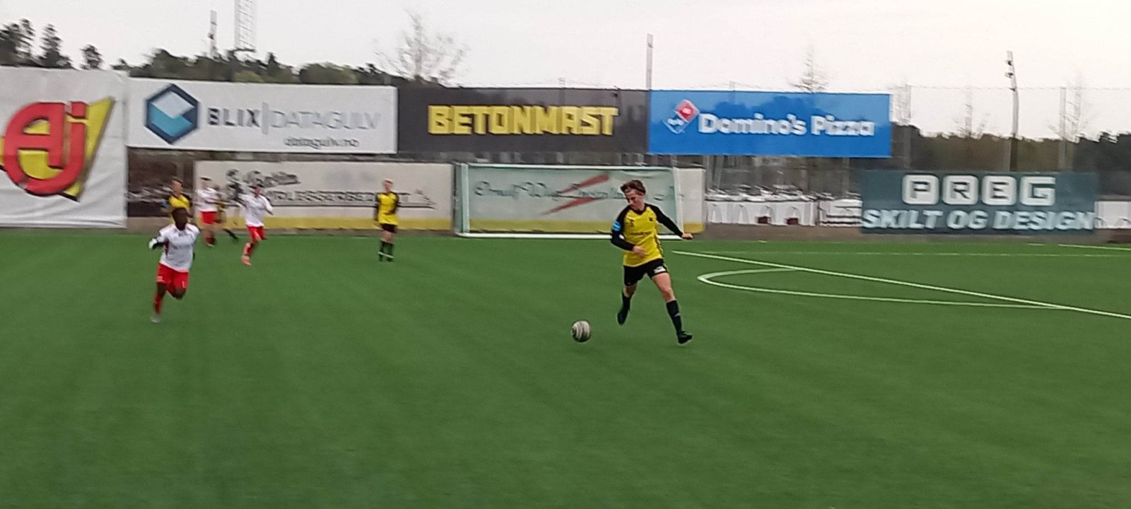 Et litt skuffende antall på tribunen fikk se at vi Gule var hakket vassere i første halvdel av 1.omgang. For all del, det er ikke noe City-fotball her ute. Begge lag har enkle pasningsfeil og spiller oppjaget. Men for å omskrive George Orwell "Alle spilte rotete, men noen mer rotete enn andre".