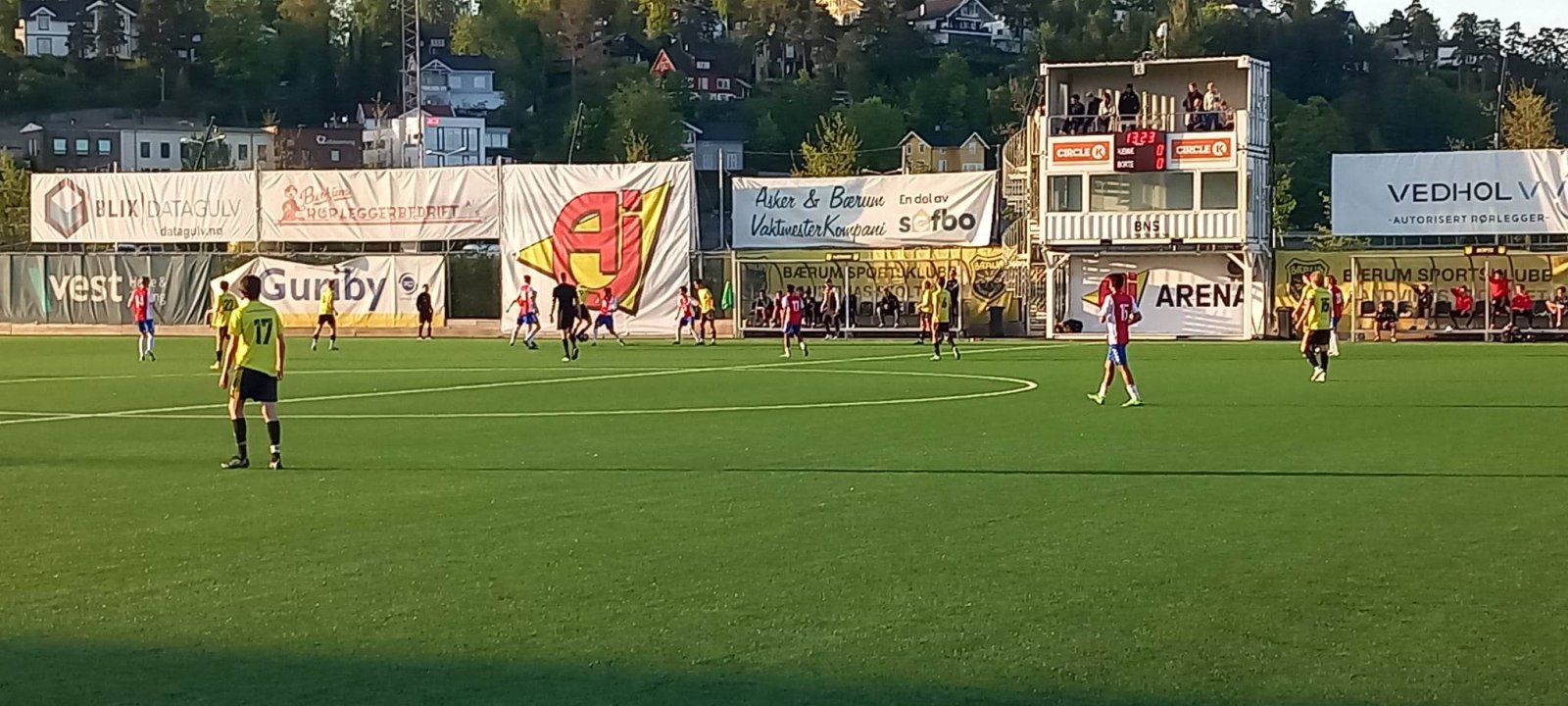 Så går det noen minutter før kampbildet setter seg som veps på slytetøyboksen i kiosken. Dessverre for vår del er det KFUM som stikker i fra. Bokstavelig talt, for de kommer til innlegg og avslutning langs kantene.