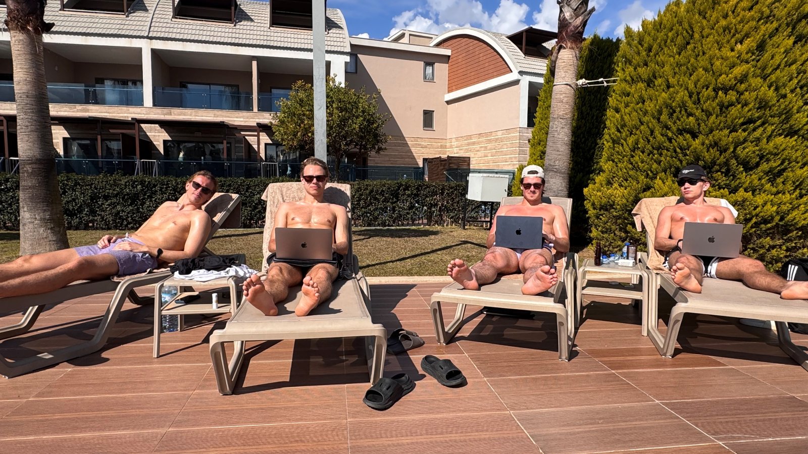 Etter et tett og tøft treningsprogram - med en hard kamp mot tsjekkiske Sigma Olomouc i går - Vi tar med oss mye lærdom fra kampen, fikk gutta etterlengtet tid til restitusjon i dag. Med krav om en egentreningsøkt i løpet av onsdagen. Flere av årets a-lagsspillere er studenter, og i formiddag hadde Eduard Hjelde samlet en kollokviegruppe i solen ved det ene bassenget på fantastiske Magic Jacaranda Hotel. Henrik Hanche Hafskjold tipset redaksjonen - som etter kort tid var på plass for å dokumentere hva gutta våre driver med.